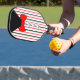 This whimsical paddle design features a red, whit and black pinstriped shirt. The shirt has silver colored buttons and a red bow tie. The back of the paddle is black with an are where you can personalize your paddle. These paddles are approved for use by USA Pickleball (formerly USAPA). The paddles are printed with my original patterns and designs; almost all can be customized. You can choose your grip color, black, white or tan. For an additional cost you can purchase a protective cover and an outdoor Pickleball Ball.