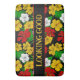 Black bathroom bathmat patterned with red, yellow and white tropical hibiscus flowers and green palm leaves. Across the middle is the quote 'LOOKING GOOD' which is customisable so you can add your own wording, or delete if you prefer