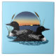 Two loons on the lake with a sunset and cattails in behind them in a backdrop of blue