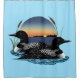 Two loons on the lake with a sunset and cattails in behind them in backdrop of blue