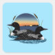 Two loons on the lake with a sunset and cattails in behind in a backdrop of blue