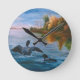 From an original oil painting by Brenda Thour of two loons on a lake at sunset with one loon flapping its wings. Copyright by Brenda Thour 2004.
