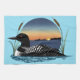 A loon on a lake with a sunset and cattails in a backdrop of blue