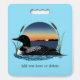 A loon on a lake with a sunset and cattails in a backdrop of blue.