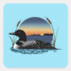 A loon on a lake with a sunset and cattails in a backdrop of blue