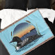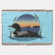 A loon on a lake with a sunset and cattails in a backdrop of blue