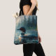 This avian-themed tote bag features an oil painting portrait of a red-eyed loon duck swimming on a body of water with the wilderness in the background. The colors are muted, and the style is somewhat impressionistic, giving this detailed bird art a somewhat moody, eerie feel.