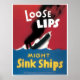 A well known phrase on a vintage WWII poster reproduction. Loose Lips Might Sink Ships. A warning about national security during World War II.