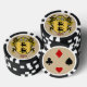 Hispanic surname Lopez historical arms set on a mottled parchment style background. The reverse of the chip has the symbols for the four suits of cards; a black spade, a red heart, a red diamond, and a black club on the same parchment style background.