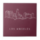 This design features a hand drawn illustration of the Los Angeles skyline on a magenta background.