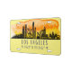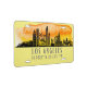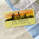 Aluminum license plate features Los Angeles California city skyline silhouette with sunset watercolor splash and latitude & longitude coordinates on pale yellow background.