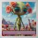 Picture a tiny, green alien with a body shaped like a plump pickle, waddling through a desert of flowers on some distant planet. It’s got gigantic, round eyes—like two shiny dinner plates—blinking in confusion as it tiptoes over fields of bright, oddly-shaped blooms that look suspiciously like rubber chickens. Its three little fingers wiggle as it balances, trying not to step on the squeaky flowers, but every now and then, it lets out a frustrated huff when one chirps underfoot. The alien’s antennae wiggle, like it's trying to figure out whether to laugh or panic, wondering why in the galaxy it’s stuck in a floral comedy show.