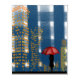 Holding a red umbrella and dwarfed by the city and it’s skyscrapers, a lone figure holding a red umbrella looks on with awe!