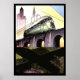 Ink and Watercolor Sketch looking up at a streamlined elevated train speeding across a brick overpass escaping from the hustle and bustle of the city, leaving the horizon of Skyscrapers behind. Post-Modern Grunge.