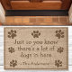 Greet visitors with humor using this "Just So You Know There’s a Lot of Dogs in Here" doormat, complete with paw print accents and customizable family name. Perfect for dog-loving households, this mat adds personality and charm to any entryway. A great gift for new homeowners, pet owners, or families with lots of furry friends.