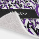 This sports themed area rug for a volleyball player features varied size purple, black & white volleyballs turned every which way on a white background and custom athlete name overlying a full length black color strip - by katz_d_zynes