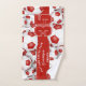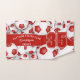 This team spirit towel for soccer players features varied size soccer balls with red & white team colors turned every which way on a white background and prominent jersey number in red overlying a full length red color strip, upon which you can also customize the athlete's name, team name & mascot name in white - by katz_d_zynes