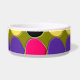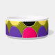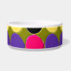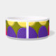 This awesome pet bowl is covered in lots of spots of purple, pink yellow and black arranged in rows separated by areas of dark green. This fantastic abstract brings to mind a wall covered in splodges of paint after a paintball game.