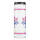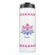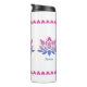 This thermal tumbler has three blue-pink colored lotus flowers with editable text to promote a calm meditative drinks break. The three items of text for you to edit are: "THANKFUL" "HAPPY" and "JOYFUL". Around the top is a pattern echoing the bright pink petal of the lotus flower below. This is repeated around the bottom of the tumbler.