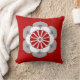 Japanese mandala design throw pillow that depicts a stylized lotus flower, symbolizing purity, spiritual awakening and faithfulness - flower in silver gray / grey, red and white, on a dark Chinese red background
