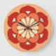 Japanese mandala design clock that depicts a stylized lotus flower, symbolizing purity, spiritual awakening and faithfulness - flower in deep mandarin orange, medium orange and cream on a soft pastel orange background