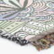 A quality printed throw has its advantages. This is a much finer weave throw than its loopier cousins, and though lighter, it is worth the investment for custom room accessorizing. The back is much prettier than the typical brown, and the fringe on the long sides very vivid, the selvage nicely done. Before photographing, I washed the throw in cold water, delicate, with a thicker woven throw the same size. On tumble dry low, this throw was dry in half the time as the other. This is a very practical quality if you use throws for furniture covers or to wrap up in frequently. The sleekness of the fabric makes it a great layer for accenting or protecting without the feeling of sitting on too much stuff. Perfect for napping or when you feel a light chill coming on. The color printing is beautiful and on this fabric, matched the design and color of my Photoshop image. This is an advantage for blending room fabrics and colors. The fringe on the short sides prints the colors from the design image and therefore varies from the side fringe. I streaked a white fractal line through the plaid pattern to give the illusion of weaving. This printed as crisp as an illusory thread, and put some white in the short side fringe, showing another advantage of print vs loomed- for artistic purposes, line lines, detail, and color integrity can be planned and preserved. My loomed throws have color limitations and more of a needlepoint texture. Print throws reproduce an exact image. The throw felt a little stiff straight out of the package, but this went away in the first delicate wash. Of course I searched the wash water for ink or bleeding and there was none.