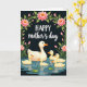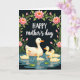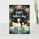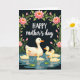 Designed with a serene pond scene, this card shows a white adult water bird with an orange beak gliding through deep blue water while four butter-yellow chicks trail closely behind, their tiny dark eyes and faint lashes giving them an affectionate, close-knit look ❤️. A curved border of leafy greens frames the scene like an archway, dotted with soft pink lotus flowers and smaller rosy buds that lean inward as if watching over the little group. The dark background makes the birds and blossoms stand out, and gentle lighting brings out the feather fluff and petal texture without looking harsh. Near the top, the message “HAPPY mother’s day” sits above the illustration in white lettering, with “mother’s day” in a more flowing style beneath the larger word. Concentric ripples spread around the birds, suggesting a calm, shared journey as the chicks keep in step beside their parent. Scattered round lily pads add extra green notes across the water, balancing the pink blooms overhead 🌼. The pond surface shows soft reflections of the birds within the deep blue ripples.