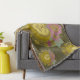 A quality printed throw has its advantages. This is a much finer weave throw than its loopier cousins, and though lighter, it is worth the investment for custom room accessorizing. The back is much prettier than the typical brown, and the fringe on the long sides very vivid, the selvage nicely done. Before photographing, I washed the throw in cold water, delicate, with a thicker woven throw the same size. On tumble dry low, this throw was dry in half the time as the other. This is a very practical quality if you use throws for furniture covers or to wrap up in frequently. The sleekness of the fabric makes it a great layer for accenting or protecting without the feeling of sitting on too much stuff. Perfect for napping or when you feel a light chill coming on. The color printing is beautiful and on this fabric, matched the design and color of my Photoshop image. This is an advantage for blending room fabrics and colors. The fringe on the short sides prints the colors from the design image and therefore varies from the side fringe. I streaked a white fractal line through the plaid pattern to give the illusion of weaving. This printed as crisp as an illusory thread, and put some white in the short side fringe, showing another advantage of print vs loomed- for artistic purposes, line lines, detail, and color integrity can be planned and preserved. My loomed throws have color limitations and more of a needlepoint texture. Print throws reproduce an exact image. The throw felt a little stiff straight out of the package, but this went away in the first delicate wash. Of course I searched the wash water for ink or bleeding and there was none.