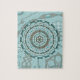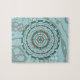 This concentric circle design features layers of white, turquoise and brown patterns inspired by Celtic weaves and Indian mehndi, such as vines, ribbons, and lotus flowers.