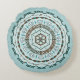 This mandala design features layers of white, turquoise and brown patterns inspired by Celtic weaves and Indian mehndi, such as vines, ribbons, and lotus flowers.