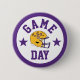This spirited button design proudly showcases support for the Louisiana State University Tigers on game day! It features a classic gold football helmet with the iconic purple "LSU" logo, centered within a bold white circle. Above and below the helmet, the words "GAME" and "DAY" are boldly presented in purple, block lettering, perfectly capturing the excitement of game day. Two purple stars flank the helmet, adding to the energetic display. The design is framed by a bold purple outer border, making it an ideal way to show your allegiance to Louisiana State University's athletic teams.