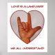 My painting of a hand making the sign for "I Love You" in American Sign Language is enclosed in the shape of a heart. Love Is A Language We All Understand.