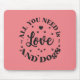 “Love and Dogs” Themed Mouse Pad. : A“Love and Dogs” Themed Mouse Pad featuring a white circular graphic with the phrase “ALL YOU NEED IS LOVE AND DOGS,” accentuated by hearts and paw prints. This “Love and Dogs” Themed Mouse Paditem appeals to dog enthusiasts and promotes love as an essential sentiment.