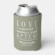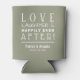 Personalized can cooler wedding favors! We show sage green with white lettering, but you can change to any colors. The wording "Love, Laughter & Happily Ever After," your names and wedding date on the front, these make a fun favor idea for wedding shower, rehearsal dinner, engagement party, wedding reception or anniversary party. MORE COLORS in our store.