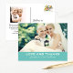 Classic wedding thank you post card template features a photo on the front and back, "Love and Thanks" custom text with monogram on the front. Background color on the front (aqua blue) and back (white) of the card can be customized to another color via Customize it / Edit / Background.