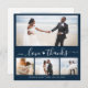 "Love and Thanks" Hand Lettered Script Heart Elegant, Minimalist Wedding Photo Collage Thank You Card in navy blue. Simple cute wedding card template featuring four (4) photo on the front and one photo on the back side. With the text "Love and thanks" in a pretty hand lettered swash tail typography script font. Add your name and thank you message.