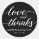 White type on black/dark background. Personalize these elegant and stylish "love and thanks" stickers for your wedding. Use them on gift bags, cards, favor boxes and other giveaways.