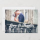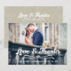 LOVE AND THANKS TYPOGRAPHY WEDDING PHOTO THANK YOU CARD. Design by Elke Clarke© for MonogramGallery printed by Zazzle. Send out your wedding thank you message as newly weds to your friends and family using this retro, thank you wedding photo card with the words "Love & Thanks" written in a white bold handwriting typography script text overlay. Replace the sample photo with your own. Add your personal thank you message on the back or leave blank and hand write your message in person. Other colors available. Burlap linen background is a printed photo effect.
