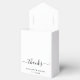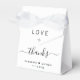 Chic wedding white favor box featuring "Love + Thanks" in simple modern typography and an elegant script with swashes, your first names joined together by a heart and your wedding date.