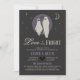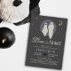 The perfect romantic yet spooky invitation for your Halloween couple's shower, here's a Love at first fright themed invitation with a spooky couple standing close together and gazing into one another's hollow eyes with a heart conjured between them against a backdrop of a starry midnight sky with a crescent moon in dusty shades of charcoal, off-white and purple.