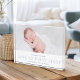 Simple and modern baby photo keepsake block features your favorite horizontal or landscape oriented newborn photo, with a white band along the bottom reading "love at first sight" in light grey, flanked by your little one's name and birth stats. A modern and minimal gender neutral design that makes a perfect gift for new parents.
