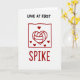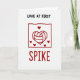 This sports greeting card features a white background with a red heart designed like a volleyball, complete with curved panel lines in the center. A hand-drawn-looking red rectangular frame surrounds the heart, and a few small solid red hearts sit around it inside the frame. The main heart looks smooth and balanced, giving the design a warm, sporty feel. At the top, the text “LOVE AT FIRST” appears in black, all-caps block letters. Near the bottom, the word “SPIKE” is printed larger in red, also in all-caps, and it stands out as the strongest line of text. The simple red, black, and white color scheme keeps the message clear and easy to read, while tying romance and volleyball together ❤️