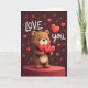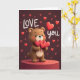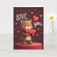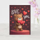 This greeting card shows a chubby brown bear with a smooth look, standing on a red round pedestal and holding three shiny red hearts close to its chest. The bear has a wide, gentle smile and light pink cheeks that make it look sweet and a little shy. The background is a dark maroon, with small red hearts floating around the bear like confetti. On the left side, the words “LOVE” appear in rounded white letters, and on the right side it says “YOU,” also in rounded white letters. A large red heart sits between the bear and the word “YOU,” helping the message stand out. The simple colors and soft lighting keep the focus on love and caring, making it feel perfect for a partner or a close friend 💘❤️.