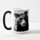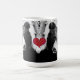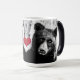 Two fuzzy bears with a heart in between. Bears in black, white and gray tones, pink and red heart. Customize each mug with any name if desired.