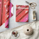 Wrapping paper featuring a striped pattern in lively fuchsia pink and red hues with singing love birds and hearts.