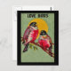 This vintage illustrations has two red and black love birds sitting on a branch with a large yellow sun in the background. It has a green and black background with the words Love Birds. See my store Art by MAR for matching products with this design.