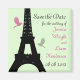 Subtle shades of pink and green, fancy French script and a beautiful silhouette of the Eiffel Tower accent the romance of your Parisian themed event with this Save the Date. It is part of the full wedding line Love Birds (green), and also available as a card.