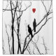 Two birds silhouetted on branches with a heart floating above. Black, white and red for a minimalistic style.