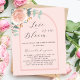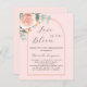 A rose gold background with a rose gold and pink arch. Decorated with a rose gold and blush pink floral, rose flower and green watercolored eucalyptus greenery. Personalize and add the name of the bride to be and party details. Text: Love in Bloom