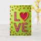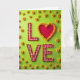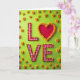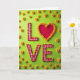 This greeting card shows the word “LOVE” centered on a bright lime-green background. The letters L, V, and E look like red-and-white gingham fabric shapes, like a picnic cloth. Around those letters, there’s a thin outline made of tiny red and yellow flower buds that adds a careful, detailed touch. The “O” is a deep red heart with a smooth look, standing out right away ❤️. A ring of soft yellow chrysanthemum flowers frames the heart, and a few more of the same flowers are scattered around the green space. The text appears in big, simple cutout-style letters, with the heart taking the place of the O right in the middle. It feels meaningful because the heart and flowers make the message easy to feel, even before you read it 🥰, and it’s a sweet way to share Valentine’s Day.